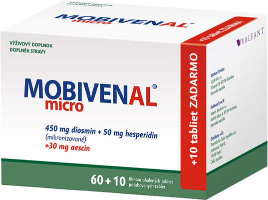 MOBIVENAL micro a MOBIVENAL micro Simple sú výživové doplnky, ktoré obsahujú flavonoidy diosmín (450 mg) a hesperidín (50 mg) vo forme mikronizovanej purifikovanej flavonoidnej frakcie (MPFF). Mobivenal micro je zároveň obohatený o aescín z pagaštanu konského. HESPERIDÍN sa získava extrakciou zo šupiek nezrelých plodov pomarančov Ruta aurantiae. DIOZMÍN sa vyrába chemickou syntézou z hesperidínu. Mobivenal sa cielene vyrába tak, aby obsahoval obidve aktívne látky, a to ako diozmín, tak aj hesperidín. Práve túto kombináciu obsahujú aj lieky, ktoré boli v praxi preverené ako úspešné v liečbe ochorení cievnej sústavy.