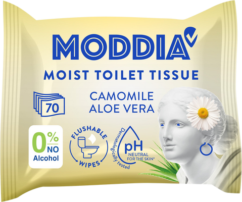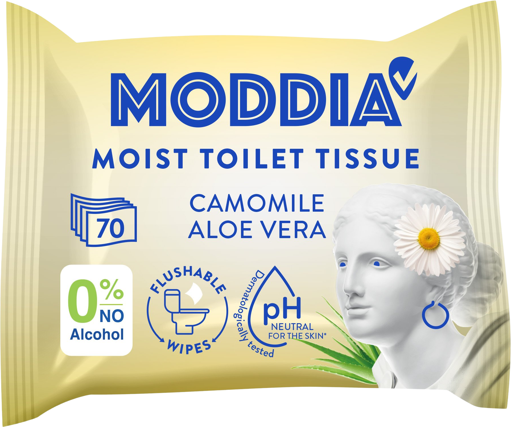 Vlhčený toaletný papier Moddia s výťažkami z harmančeka a aloe vera je vaším spoľahlivým pomocníkom pre dokonalú hygienu. Viac informácií
