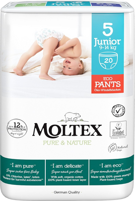 Moltex Pure & Nature Natiahacie plienkové nohavičky Junior 9–14 kg 20 ksVšetko o produkteDoplňujúce informácieHodnotenie produktuBalenie plienok je vyrobené z plastu z cukrovej trstiny namiesto ropných plastov. Plienky sú nové vyrábané v Belgicku pri zachovaní nemeckej kvality.