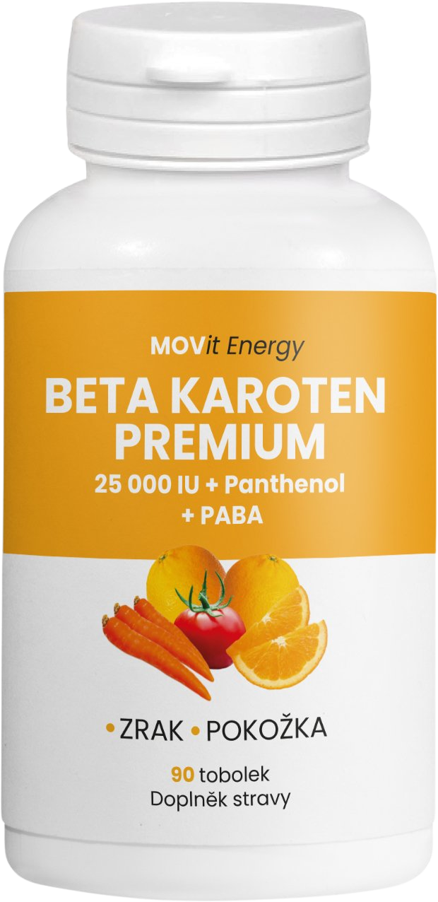 Betakarotén je provitamínom vitamínu A, ktorý sa v tele podľa potreby mení na vitamín A. Prispieva k normálnemu stavu pokožky, slizníc, zraku a imunitného systému. MOVit Beta Karoten PREMIUM obsahuje vysokú dávku beta karoténu a je doplnený o vitamín B5 (pantenol) a telu vlastnú látku PABA. Prípravok je vhodný aj pre vegetariánov.