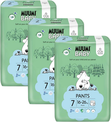 Muumi Baby Pants 7 XL 16-26 kg, mesačné balenie nohavičkových eko plienok, 102 ksVšetko o produkteDoplňujúce informácieHodnotenie produktuEko plienkové nohavičky na denné i nočné nosenie, ktoré obsahujú dvojitú ochranu pred únikom. Sú hypoalergénne, neobsahujú žiadne chemikálie, zbytočné vône či pleťové vody. Vyrábané sú iba z certifikovanej BIO fínskej celulózy, bielenej kyslíkom. Sú tak 100% bez chlóru.