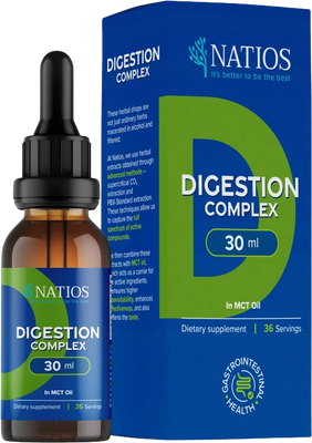 Natios Digestion Complex, Bylinné kvapky v MCT oleji 30 mlVšetko o produkteDoplňujúce informácieHodnotenie produktuNatyos bylinné kvapky sú vyrobené zo silných extraktov a sú dodávané v MCT oleji. Nie sú to teda len klasické alkoholové nálevy, ale koncentrované extrakty bez zbytočnej chémie, ktoré sú šetrné k žalúdku, majú jemnú chuť a zároveň poskytujú maximálny účinok.