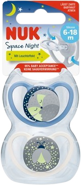Dojčenský cumlík NUK Space Nights 6-18 mesiacov so svietiacim efektom. Priehľadný silikónový materiál sa ľahko čistí a je zvlášť odolný voči teplu. Neobsahuje škodlivé látky, je odolný proti varu, bez zápachu, transparentná a má hladký povrch. Všetky cumlíky NUK disponujú air-systemom NUK, ktorý umožňuje, aby jemná pokožka bábätka mohla dýchať. Viac informácií