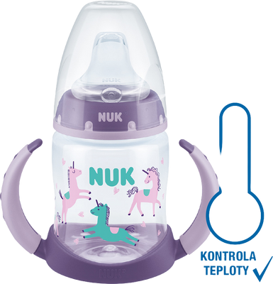 Fľaštička na učenie značky NUK má extra široké a mäkký náustok, ktoré zaručuje prirodzený pocit pitie hneď od začiatku. Uľahčí tak deťom prechod z dojčenia na fľašku. Fľaštička je určená pre deti od 6 do 18 mesiacov. Indikátor kontroly teploty - modrá farba sa zmení na bielu, ak je obsah príliš horúci. Viac informácií