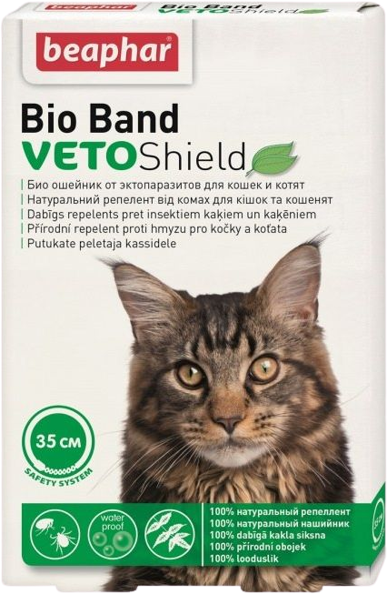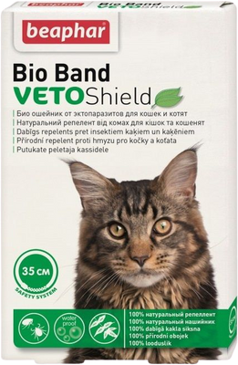 Beaphar Bio Band Veto Shield Repelentný obojok 35 cmVšetko o produkteDoplňujúce informácieHodnotenie produktuZabudnite na chémiu, ktorá môže ublížiť mačičke aj Vám. Firma Beaphar vyvinula jedinečný, úplne biologický repelentný obojok založený na báze prírodných zložiek. Levanduľový olej s esenciami nimby (margózy) predstavuje veľmi účinnú kombináciu, ktorá odpudzuje blchy aj kliešte. Pre človeka aj mačku ide o veľmi príjemnú, sviežu, levanduľovú vôňu, ktorá pôsobí ako trvalý ochranný plášť.