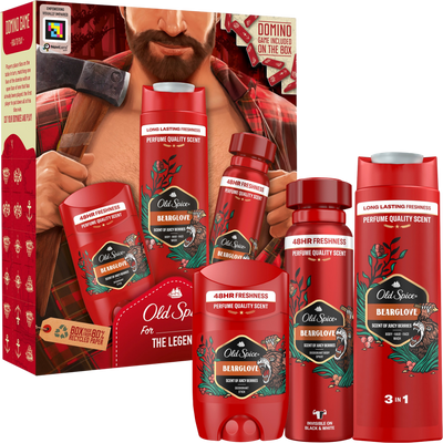 Darčeková súprava Old Spice Lumberjack pre mužov s dezodorantom v spreji, tuhým dezodorantom a sprchovým gélom Bearglove. Viac informácií