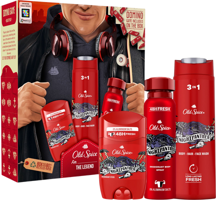 Old Spice City explorer darčeková sada s deodorantom tuhým av spreji, sprchovým gélom Night PantherVšetko o produkteDoplňujúce informácieHodnotenie produktuS neodolateľnou mužnou vôňou Old Spice totiž nemôžete urobiť chybu. Darčeková sada City Explorer od Old Spice obsahuje tuhý dezodorant, deodorant v spreji a sprchový gél pre mužov 400 ml Night Panther. Toaletné potreby sú zabalené v kartónovej krabičke s designom Wild Explorer, z ktorej si môže vyrobiť domino.