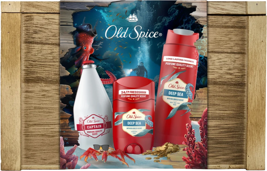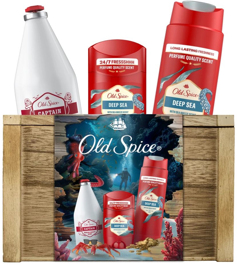 Old Spice Treasure Chest pre mužov, tuhý dezodorant a sprchový gél Deep Sea a voda po holení CaptainVšetko o produkteDoplňujúce informácieHodnotenie produktuDarčeková sada Treasure Chest od Old Spice obsahuje tuhý dezodorant a mužný sprchový gél Deep Sea plus vodu po holení Captain, to všetko zabalené v drevenej truhlici Old Spice. Toaletné potreby v sade Treasure Chest majú vôňu Deep Sea, sviežu vôňu oceánu, a vôňu Captain s tónmi vody a citrusov, ktorá je naša najlepšie hodnotená vôňa*. S touto kombináciou nemôžete urobiť chybu.