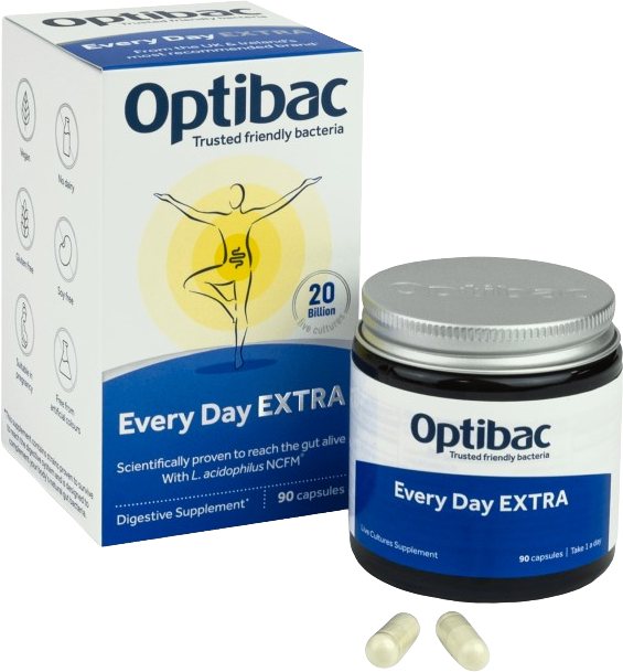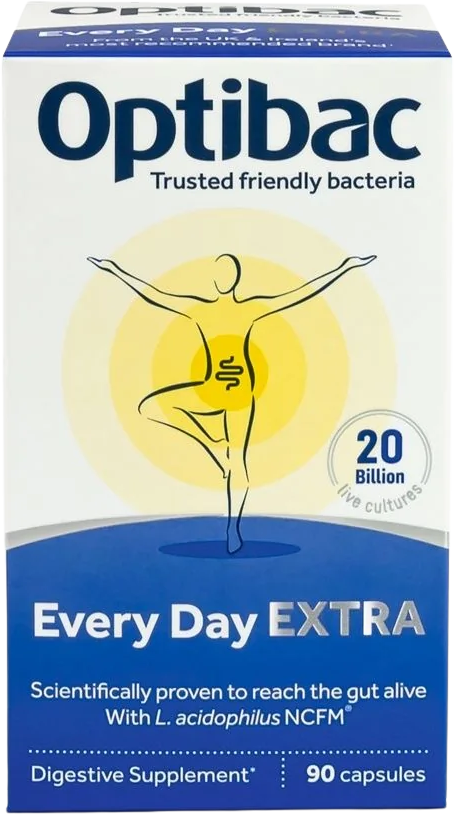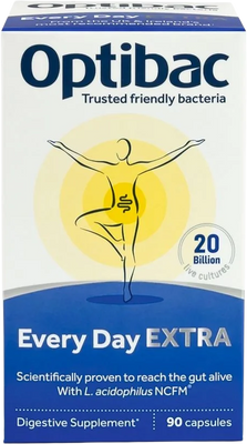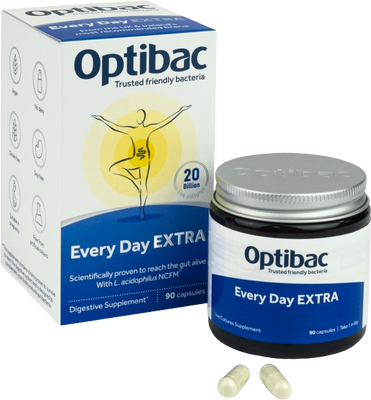 Optibac Every Day EXTRA je komplex vysokokvalitných probiotík na každodenné užívanie a na podporu črevného mikrobiómu po užívaní antibiotík. Obsahuje priateľské mikroorganizmy zo skupiny laktobacilov a bifidobaktérií v zosilnenej dávke 20 miliárd CFU v každej kapsule. Bolo preukázané, že všetky štyri kmene probiotických kultúr prechádzajú cez kyslé prostredie žalúdka a dostávajú sa do čreva.