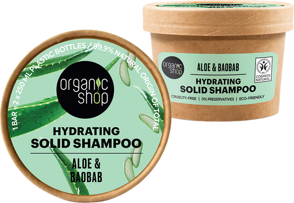 Organic Shop Hydratačný tuhý šampón Aloe a baobab 60 gVšetko o produkteDoplňujúce informácieHodnotenie produktuDoprajte si maximálnu hydratáciu s týmto šampónom, ktorý obnoví prirodzenú hebkosť vašich vlasov! Aloe je účinná kozmetická zložka, ktorá dokonale hydratuje vlasy vďaka alantoínu a vitamínom C a E. 1 tuhý šampón = 2 × 250 ml tekutého šampónu!