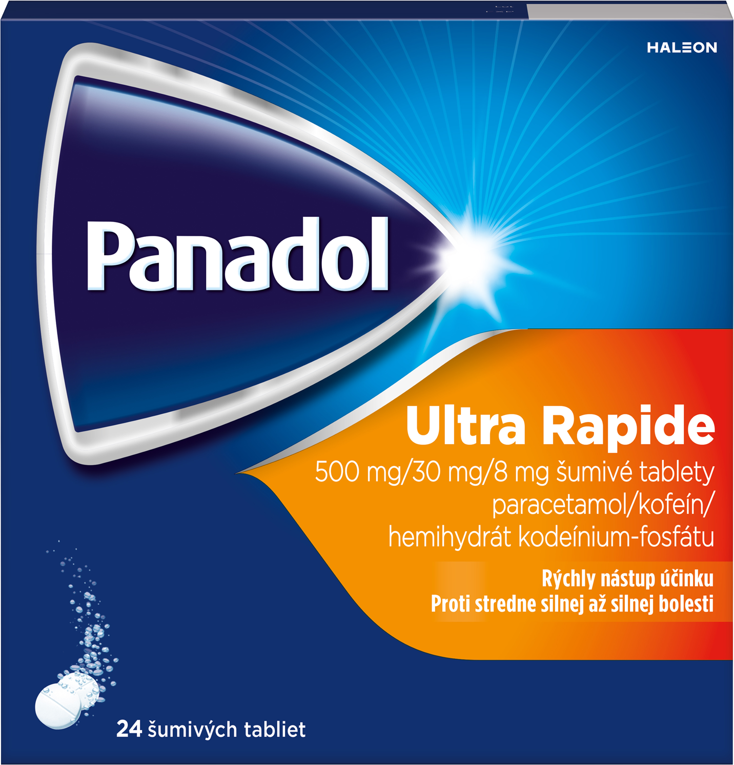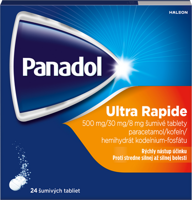 Panadol Ultra Rapide šumivé tablety s rýchlym nástupom účinku. Pôsobí proti stredne silnej až silnej bolesti a znižuje horúčku. Paracetamol pôsobí proti bolesti a znižuje horúčku.Kofeín zosilňuje jeho účinok. Kodeín tiež tlmí kašeľ. Viac informácií