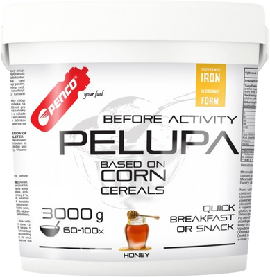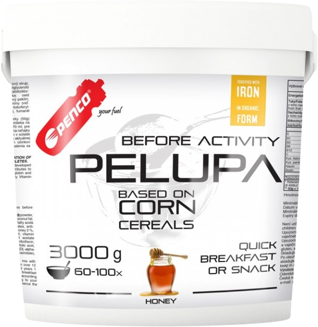 PENCO®PELUPA je instantná zdravá kaše na báze kukurice a medu. Poskytuje všetky potrebné živiny na udržanie výkonnosti a zníženie pocitu hladu počas tréningu alebo pretekov. Okrem širokej škály vitamínov a minerálov obsahuje kompletné bielkoviny, ktoré sú nevyhnutné pre regeneráciu a rast svalov, a polysacharidy, ktoré poskytujú potrebné množstvo energie na začiatok dňa.