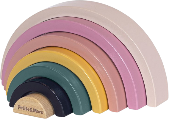 Drevená skladacia hračka STARDUST v tvare dúhy rozvíja motorické zručnosti,schopnosť rozpoznávať tvary a farby astimuluje vizuálnu a priestorovú predstavivosť.