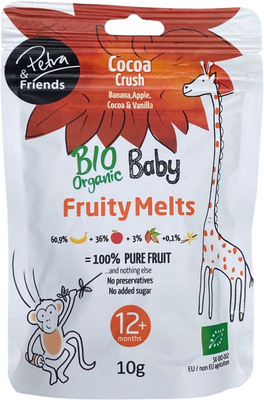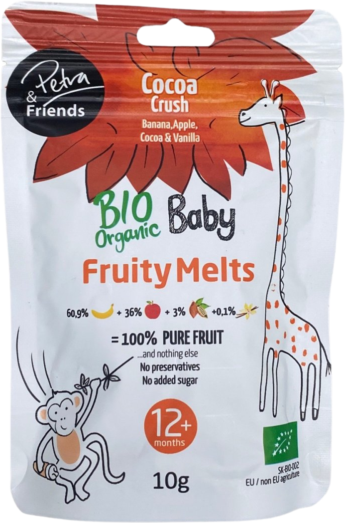 Petra & Friends BIO Ovocné smoothie kúsky sušené mrazom - banán, jablko, kakao a vanilka 10 gVšetko o produkteDoplňujúce informácieHodnotenie produktuChrumkavé kúsky plné ovocia. Vyrába sa z banánov, jabĺk, kakaového prášku a vanilky, nič ďalšie v zložení nenájdete. V ústach sa ľahko rozpúšťa, takže sa nemusíte obávať zaskočenia. Suší sa mrazom (lyofilizácia), preto zostáva zachovaná väčšina vitamínov a minerálnych látok z použitého ovocia. V porovnaní s klasickým sušením ovocia navyše pri lyofilizácii nehrozí vznik plesní. Ovocné smoothie kúsky sú vhodné pre deti už od ukončeného 12. mesiaca.
