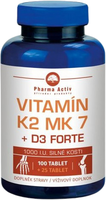 Pharma Activ Vitamin K2 MK 7+D3 Forte 100+25tbl ZDARMAVšetko o produkteDoplňujúce informácieHodnotenie produktu- Vitamín D3 (cholekalciferol) prispieva k normálnemu vstrebávaniu/využívaniu vápnika a fosforu