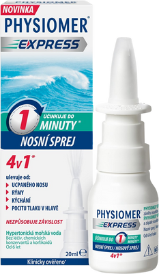 Physiomer Express hypertonický nosný sprej 20 mlVšetko o produkteDoplňujúce informácieHodnotenie produktuNosový sprej je hypertonický roztok morskej vody s obsahom esenciálneho oleja z niaouli (rastilna Melaleuca quinquenervia). Pôsobí ako prírodné a účinné dekongestívum (zmierňuje opuch nosa). Je klinicky preukázané, že uvoľňuje nos do 1 minúty* a uľavuje od príznakov nádchy, prechladnutia a zápalu nosohltana. Dá sa použiť na cca 280 vstrekov.