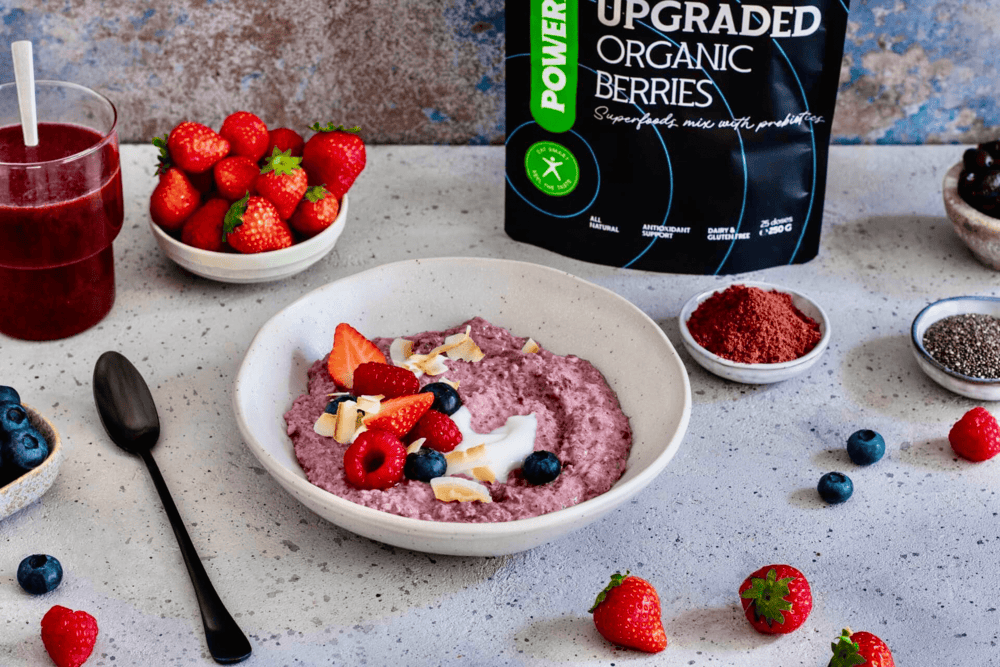 Powerlogy Upgraded Organic Berries 300 g je funkčná zmes červených superpotravín určená na podporu imunity, regenerácie a prirodzenej energie. Kombinuje silu lyofilizovaného ovocia (jahody, maliny, čučoriedky) s výťažkami z aceroly, camu camu, červenej repy a granátového jablka – prírodných zdrojov vitamínu C a antioxidantov. Pridané MCT tuky z kokosu uľahčujú vstrebávanie živín, zatiaľ čo zmes podporuje stabilnú energiu a výkonnosť bez prudkého nárastu cukru. Neobsahuje pridané cukry, lepok, palmový olej ani umelé farbivá.