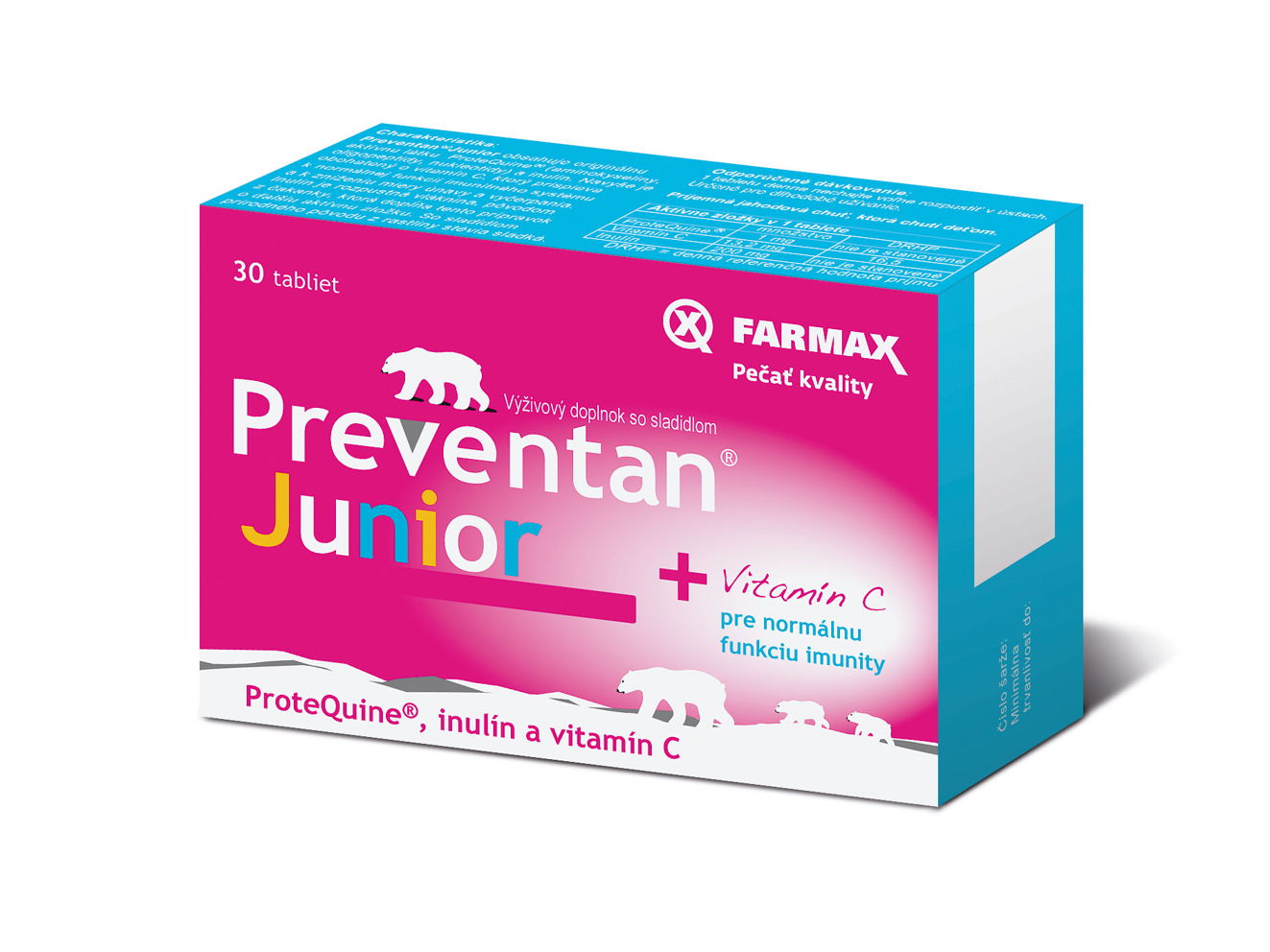 Preventan Junior a Preventan Junior ovocný mix obsahujú zmes biologicky aktívnych látok ProteQuine® (aminokyseliny, oligopeptidy, nukleotidy), inulín, rozpustnú vlákninu pôvodom z čakanky, a vitamín C, ktorý prispieva k normálnej funkcii imunitného systému a k zníženiu vyčerpania a únavy. Neobsahujú cukor – sú sladené prírodným sladidlom zo stévie cukrovej a xylitolom. Preventan Junior je bez glutenu a je určený na dlhodobé a pravidelnému užívanie predovšetkým pre deti od 3 do 15 rokov.