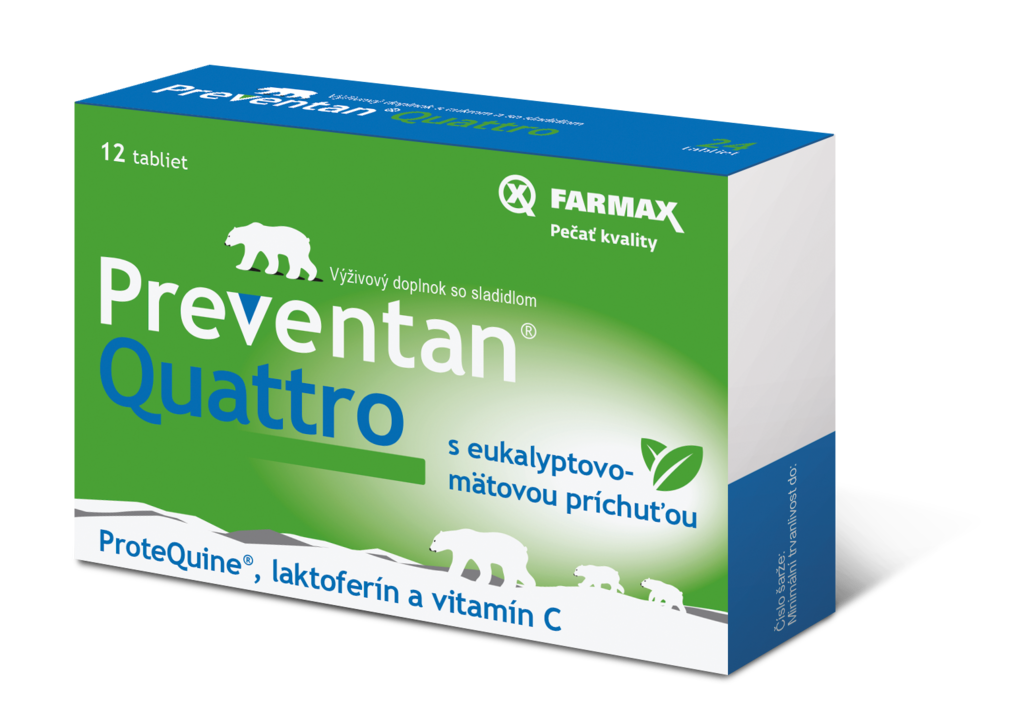 Voľba na prechodné obdobia, keď sú rána ešte chladné a dni teplé. Ľahko sa stane, že nesprávne odhadnete počasie a oblečiete sa naľahko. Presne na takéto situácie sú určené Preventan® Quattro a Preventan® Quattro s citrónovou príchuťou, doplnky stravy so sladidlom. Obsahujú štvoricu aktívnych látok – ProteQuine® (jedinečnú zmes biologicky aktívnych látok – aminokyseliny, oligopeptidy, nukleotidy), laktoferín vo forme kolostra, eukalypto-mätové silice a vitamín C, ktorý navyše prispieva k normálnej funkcii imunitného systému a zníženiu vyčerpania a únavy.