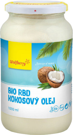 Rafinovaný kokosový olej, ktorý musí byť vždy označovaný skratkou RBD (R-Rafinated, B-Bleached, D-Deodorized), čo presne znamená rafinovaný, bielený a zbavený arómy. Viac informácií