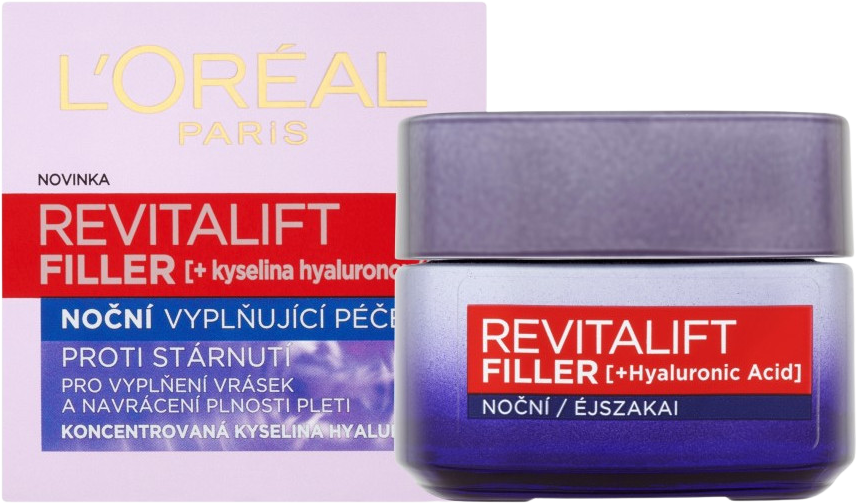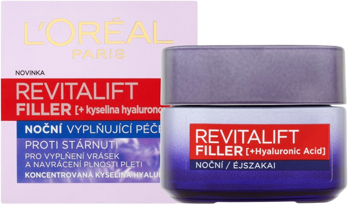 L'Oréal Paris Revitalift Filler HA nočný krém 50 mlVšetko o produkteDoplňujúce informácieHodnotenie produktuNočný krém Revitalift Filler je určený pre ženy, ktoré chcú svojej navrátiť mladistvý vzhľad, pružnosť a kontúry. Kyselina hyalurónová je prírodná látka, ktorá prináša prirodzené výsledky, účinkuje v dvoch krokoch: zvláčňuje kožu v jej hlbokých vrstvách a stimuluje väzivové bunky fibroblasty k rýchlejšej produkcii kolagénu.