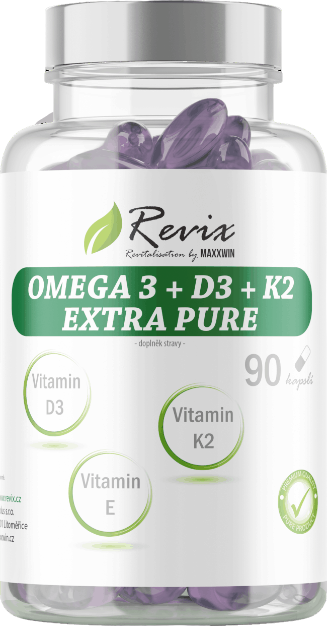 Revix Omega 3 + D3 + K2 extra pure 90 tvrdých kapsúlVšetko o produkteDoplňujúce informácieHodnotenie produktuKapsule Softgel obsahujú EPA, DHA a vvitamín E, vvitamín D3 a vvitamín K2.