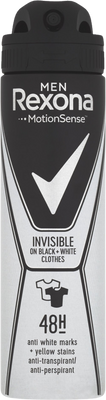 Rexona Men Dezodorant Invisible Black+White 150 mlVšetko o produkteDoplňujúce informácieHodnotenie produktuAntiperspirant Rexona Men Invisible Black + White bol špeciálne vyvinutý tak, aby tvoje oblečenie zostalo krásne a bez škvŕn. Napomáha redukovať biele stopy na čiernom a žltej škvrny na bielom oblečení. Môžeš tak vyzerať skvele po celý deň.