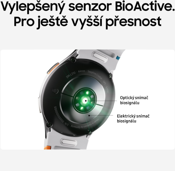 - Nová úroveň presnosti s vylepšeným snímačom: Vítajte v zariadení Galaxy Watch náš zatiaľ najpokročilejší snímač BioActive. Vďaka 13 LED svetlám a optickým a elektrickým snímačom sleduje vašu srdcovú frekvenciu, fázy spánku a ďalšie fitnes údaje s najvyššou presnosťou, takže vždy budete vedieť, ako ste na tom