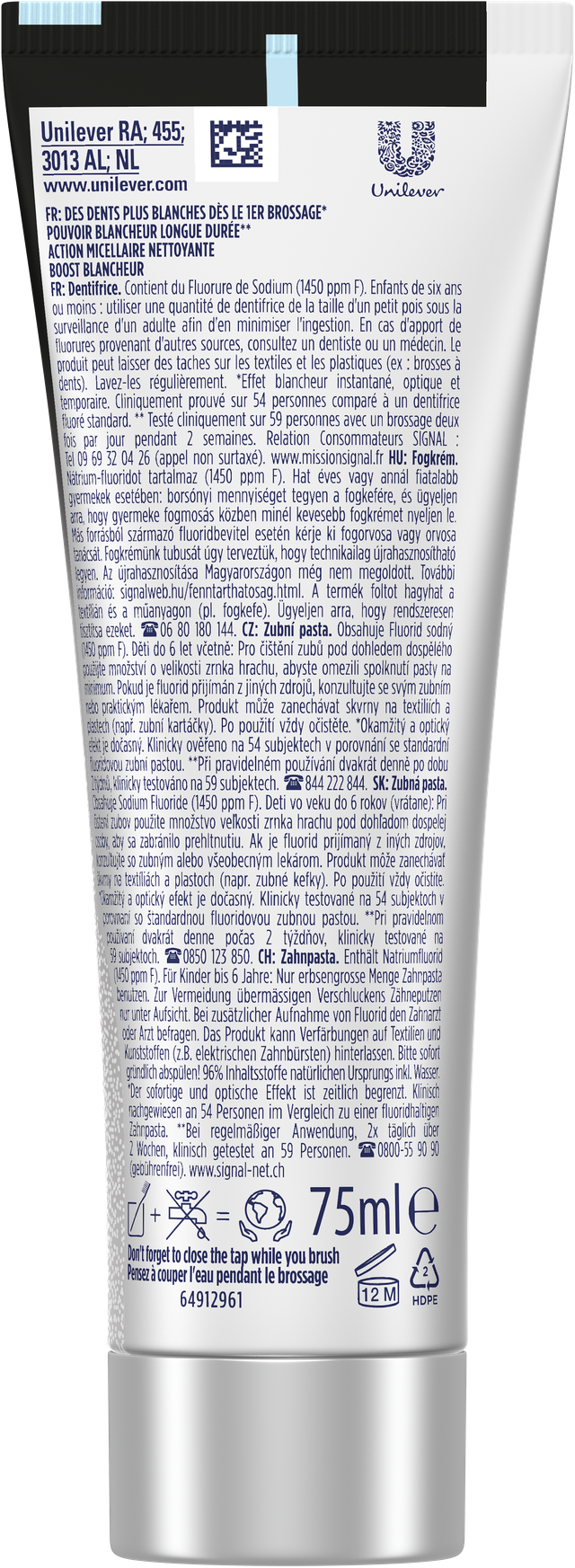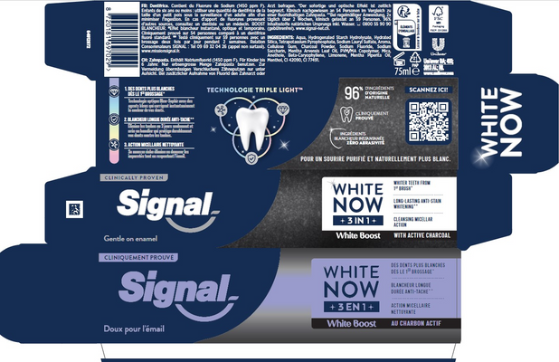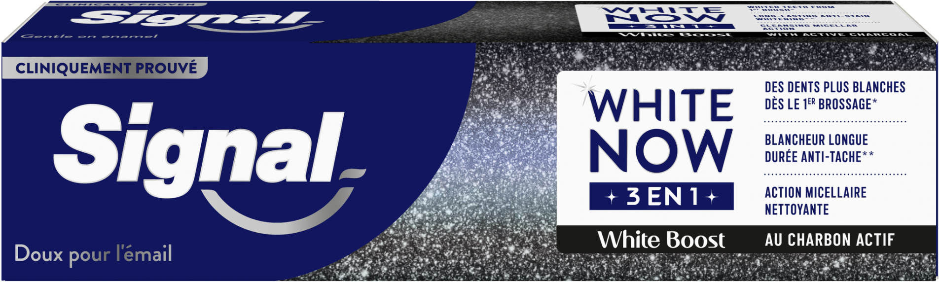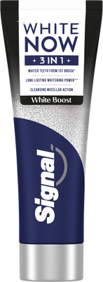 Rozsah Signal White now 3v1 prináša silnejší bieliaci účinok s dlhotrvajúcimi výsledkami vďaka novej technológii Triple-light. Okrem toho obsahuje micely, ktoré jemne odstraňujú nečistoty, takže je šetrnejší k zubnej sklovine. Viac informácií