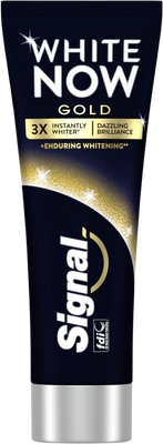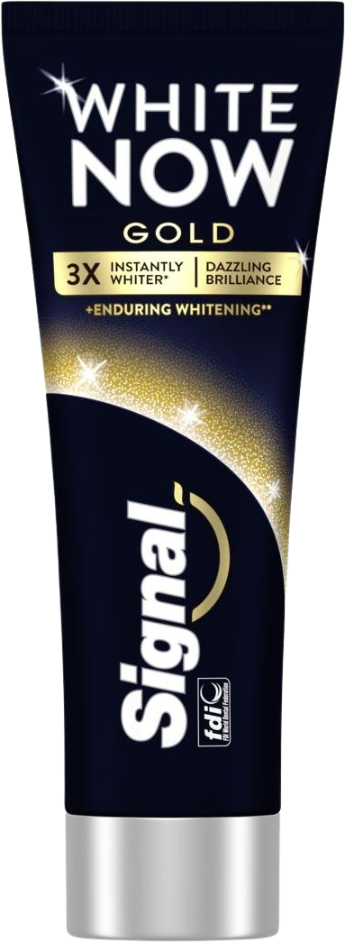 Zubnou pastou Signal White Now Gold dosiahnete 3-krát žiarivejší úsmev. Kombinácia zeleného a modrého zafírového pigmentu technológie White-Correct+ pre 3-krát belšie zuby, ihneď po použití. Užite si belšie zuby, teraz. Viac informácií