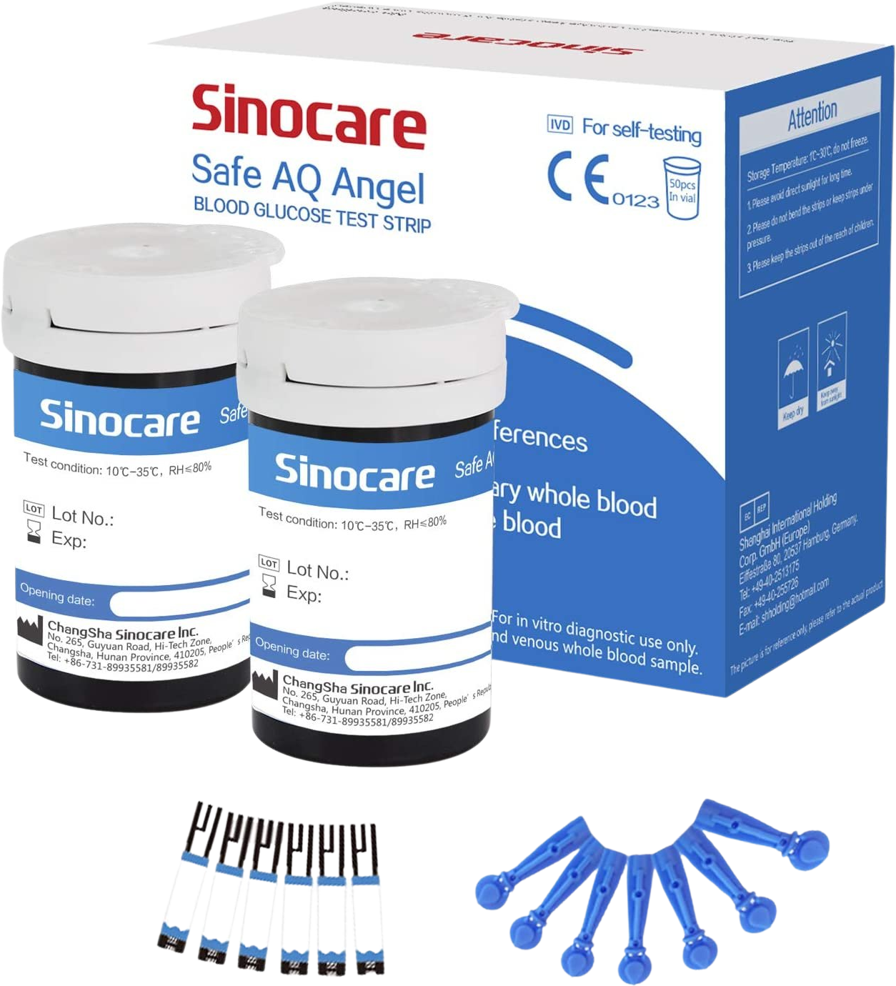 Sada Sinocare 50 náhradných prúžkov + 50 lanciet pre glukomer Safe AQ Angel