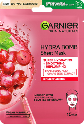 Garnier Skin Naturals Vyhladzujúca a vyplňujúca textilná maska s výťažkom z hrozna 28 gVšetko o produkteDoplňujúce informácieHodnotenie produktuIntenzívne zloženie obohatené o výťažok z hroznových jadier a kyselinu hyalurónovú pomáha na vyhladenie a vyplnenie pleti. Pôsobí ako hydratačná bomba dodávajúca pleti okamžitú sviežosť a príjemný pocit. Vhodná aj pre citlivú pleť.