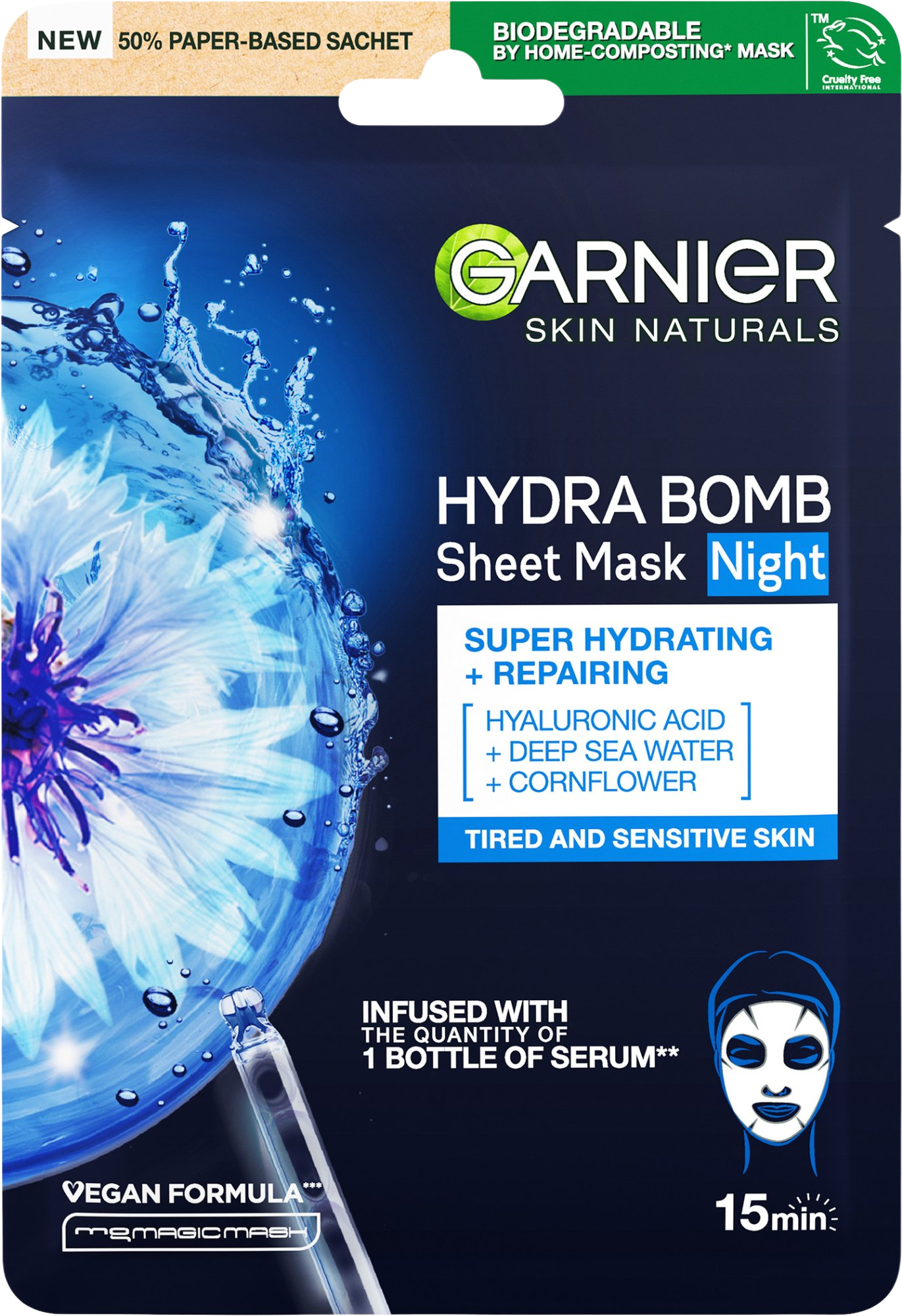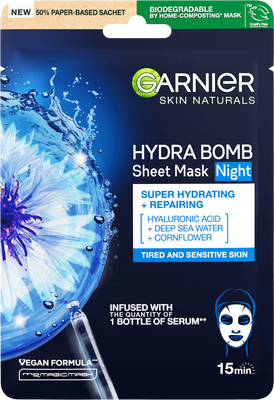 Nočná textilná maska Garnier Skin Naturals. Maska je vhodná na citlivú pokožku. Viac informácií