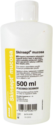 Obsah účinných látok v 100 g Skinsept Mucosy: 1,5 g chlórhexidín diglukonát roztok (20%) (zodpovedá 0,3 g chlórhexidíndiglukonátu); 1,4 g peroxid vodíka 35%; 10,4 g (12,4% obj.) Etanol 96%.