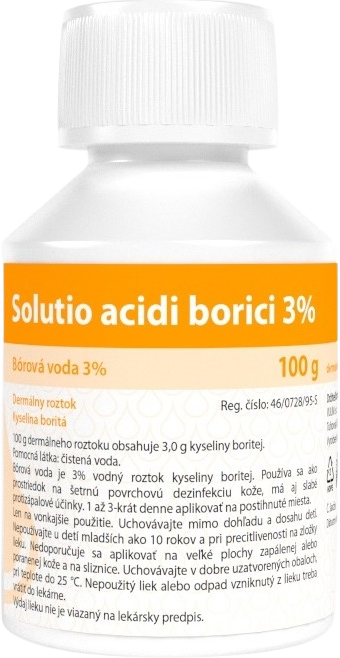Liek je 3%-ný vodný roztok kyseliny boritej určený na šetrnú povrchovú dezinfekciu kože, mierne spomaľuje množenie baktérií a plesní, pôsobí slabo protizápalovo. Má sa aplikovať 1-3 krát denne na postihnuté miesta. Nie je určený na použitie pre deti do 10 rokov. Neodporúča sa aplikovať na veľké plochy zapálenej alebo poranenej kože a na sliznice. Liek je možné používať v období gravidity a laktácie v rámci uvedených indikácií.