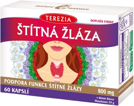 Terézia Štítna žľaza je doplnok vo forme kapsúl, ktorý obsahuje morskú riasu Laminaria, medovku lekársku, ľan siaty, chaluhu bublinatú, repeň durkoman, siaty zelený ovos, nátržník bielu.