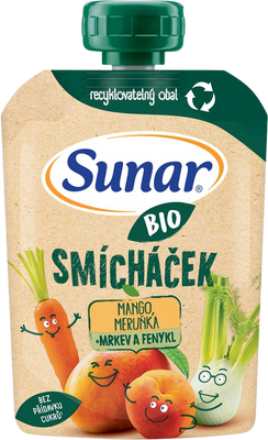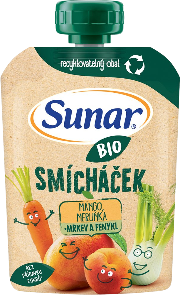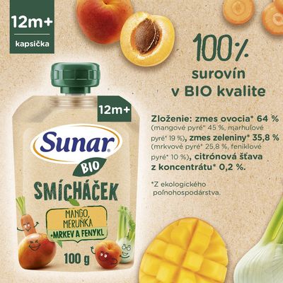 Sunar BIO Smícháček je kapsička kombinujúca ovocie so zeleninou v lahodnú desiatu v BIO baby kvalite, ktorá obsahuje minimálne 25% zeleniny. Dostať zeleninu do jedálnička malých detí je teraz jednoduché a chutné zároveň. Bez pridaného cukru. Pre deti od ukončeného 12. mesiaca. Viac informácií