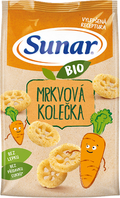 Sunar BIO mrkvové chrumky sú chutné a zdravé maškrtenie bez pridaného cukru a soli. Obsahujú BIO bezlepkové obilniny a zeleninu. Vhodné pre deti od uk. 12. mesiace. Viac informácií