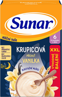 Sunar krupicová mliečna kaša na dobrú noc s obsahom plnotučného mlieka skvele chutí a zaistí spokojné bruško pred spaním. Obsahuje lepok, vhodné pre deti od ukončeného 6. mesiaca. Viac informácií