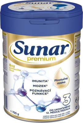 Najlepšie batoľacie mlieko Sunar Premium 3 s ešte vyšším obsahom mliečneho tuku a bez palmového oleja. Je prispôsobené špeciálnym potrebám batoliat, preto obsahuje viac dôležitých živín ako kravské mlieko. Je vhodné ako súčasť zmiešanej stravy pre deti od ukončeného 12. mesiaca veku.