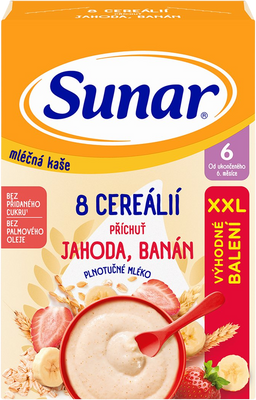 Sunar mliečna kaša s 8 cereáliami skvele chutí vďaka obsahu plnotučného mlieka. Celozrnné cereálie v kaši sú skvelým zdrojom vlákniny. Obsahuje lepok. Vhodné pre deti od ukončeného 6. mesiaca. Viac informácií