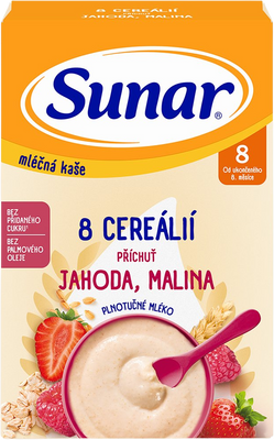 Sunar mliečna kaša s 8 cereáliami skvele chutí vďaka obsahu plnotučného mlieka. Celozrnné cereálie v kaši sú skvelým zdrojom vlákniny. Obsahuje lepok. Vhodné pre deti od ukončeného 8. mesiaca. Viac informácií