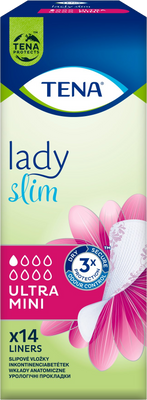 Pozrite tiež ostatné výrobky značky Tena, ktoré nájdete v kategóriách Inkontinencia, Inkontinenčné vložky a Zdravotnícky materiál. Výrobok zrecenzovalo 42 zákazníkov a 100 % z nich ho odporúča. Produkt je v zľave 29 %. Tena Lady Slim Ultra Mini 14 ks je registrovaný v databáze ŠUKL pod kódom B79116. Ak si nie ste istí výberom tohto produktu, inšpirujte sa v kategórii Inkontinenčné vložky.
