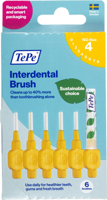 TePe Medzizubné kefky size 4 žlté 0,7 mm, papierová krabička 6 ksVšetko o produkteDoplňujúce informácieHodnotenie produktuObľúbené ekologické medzizubné kefky TePe sú teraz ešte šetrnejšie k životnému prostrediu vďaka recyklovateľnému, uzatvárateľnému papierovému obalu. Ich používaním zefektívnite starostlivosť o svoje zubné zdravie a pomôžete znížiť svoju uhlíkovú stopu.