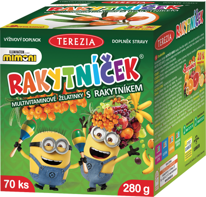 - Multivitamínové želatínky RAKYTNÍČEK MIMONI obsahujú účinnú látku rakytník a zmes ovocných koncentrátov a vitamíny