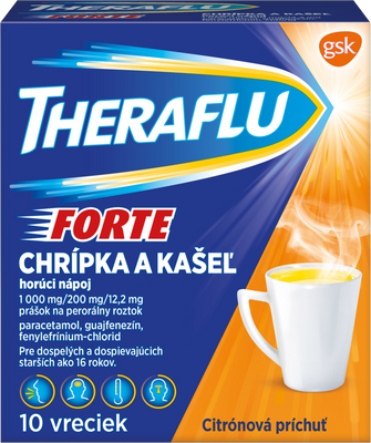 Theraflu Forte horúci nápoj bojuje s príznakmi prechladnutia a chrípky. Prináša úľavu od bolesti. Znižuje horúčku. Uvoľňuje dýchacie cesty a zmierňuje kašeľ.