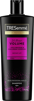 TreSemmé 24h Volume šampón pre väčší objem 400 mlVšetko o produkteDoplňujúce informácieHodnotenie produktuNáš nový šampón 24 hodín objemu okamžite posilňuje jemné vlasy, poskytuje celodenný objem a pružnosť bez zaťaženia. Obsahuje hodvábne proteíny a kolagénový komplex, ktoré premenia jemné pramene na plné vlasy. Technológia Professional Pro Style, ktorú vyvinuli naši poprední vedeckí odborníci, je založená na obsahu aktívnych aminokyselín a ceramidu a postará sa o silnejšie a poddajnejšie vlasy aj o uhladený účes.