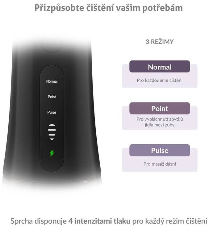 Sprcha ponúka 3 režimy čistenia s rôznou intenzitou tlaku (30 a 130 PSI) vrátane režimu POINT, ktorý cielene a účinne odstraňuje zvyšky jedla z medzizubných priestorov.