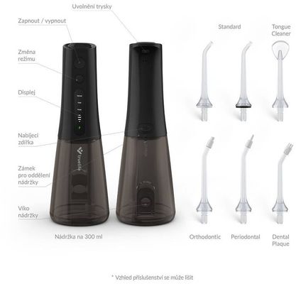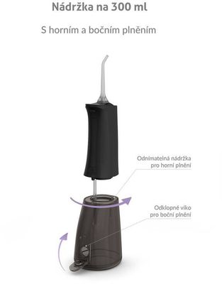 Objem 300 ml postačuje na vyčistenie celého chrupu a zároveň je dostatočne kompaktný. Okrem obyčajnej vody ju môžete naplniť aj ústnou vodou pre väčšiu sviežosť.