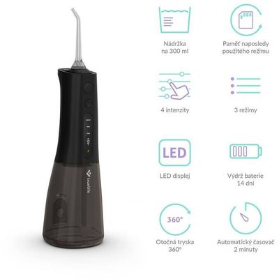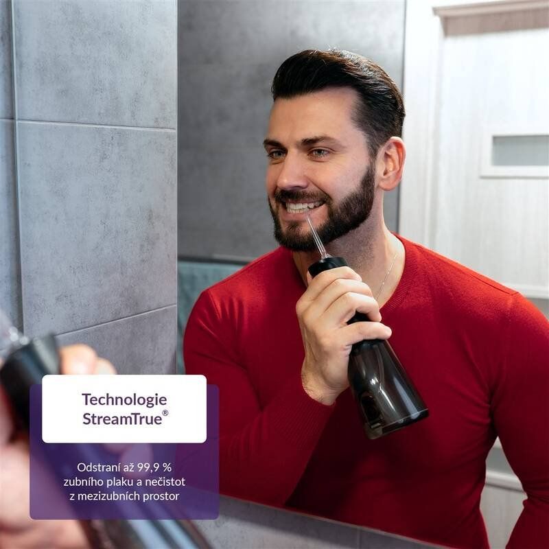 Zubné priestory bývajú útočiskom baktérií, ktoré spôsobujú zubný kaz. Najúčinnejším spôsobom, ako sa ich zbaviť, je každodenné čistenie nielen zubov, ale aj priestoru medzi nimi. Špeciálne zubné kefky alebo dentálne nite nemusia byť veľmi pohodlné a naša peňaženka pociťuje záťaž pri ich neustálom kupovaní. Ústna sprcha TrueLife AquaFloss Compact L100 Black je v každom ohľade úspornejším riešením s 3 režimami čistenia, najmä s režimom POINT, ktorý cielene a účinne odstraňuje zvyšky jedla z medzizubných priestorov. Nádržka s objemom 300 ml s dvojitým plnením, horným a bočným, pohodlne vystačí na dvojminútové čistenie, ktoré sleduje integrovaný časovač. Pohodlné je, že plnenie nádržky zhora cez väčší otvor je oveľa rýchlejšie a jednoduchšie ako plnenie cez menší otvor na boku, ktorý majú štandardné ústne sprchy. Vďaka tomu je celá príprava a používanie ústnej sprchy rýchlejšie a pohodlnejšie. Dokonalú starostlivosť poskytuje 6 trysiek pre rôzne potreby zubov, od klasického čistenia cez čistenie jazyka a odstraňovanie zubného povlaku až po ortodontické alebo parodontologické potreby. Na používanie sprchy nie je potrebné žiadne pripojenie do elektrickej siete, jej batéria vydrží až 14 dní pri používaní dvakrát denne. Vďaka kompaktnému dizajnu môže sprcha dokonca cestovať s vami. Na prehľadnom displeji sa zobrazujú aktuálne nastavenia, zatiaľ čo funkcia pamäte zabezpečí, že sa po zapnutí aktivuje naposledy použitý režim.